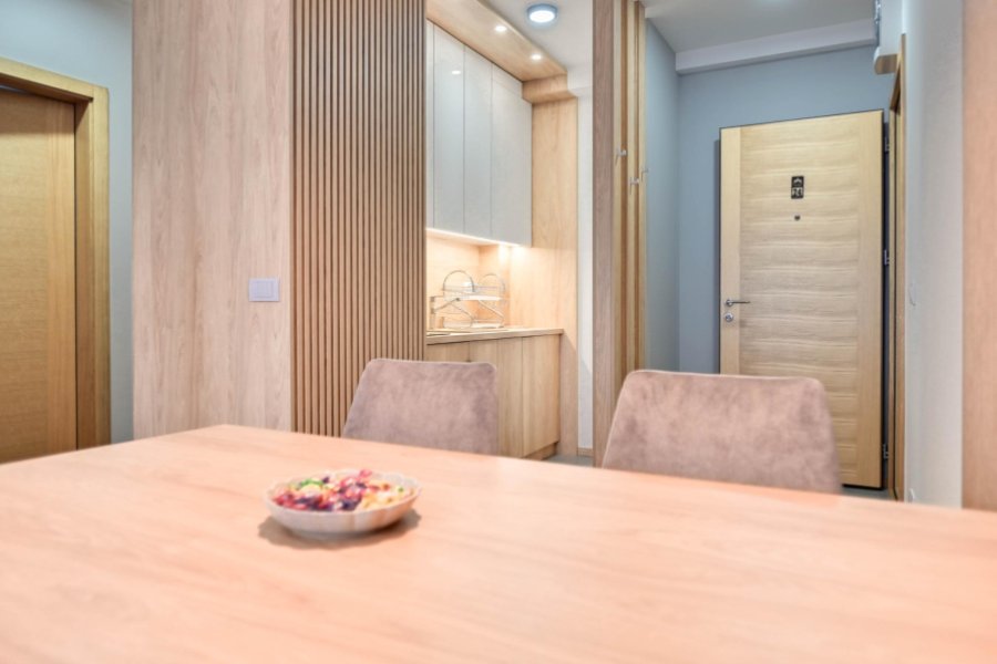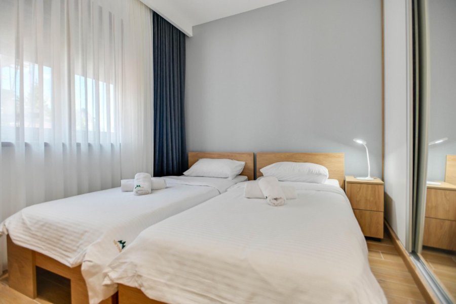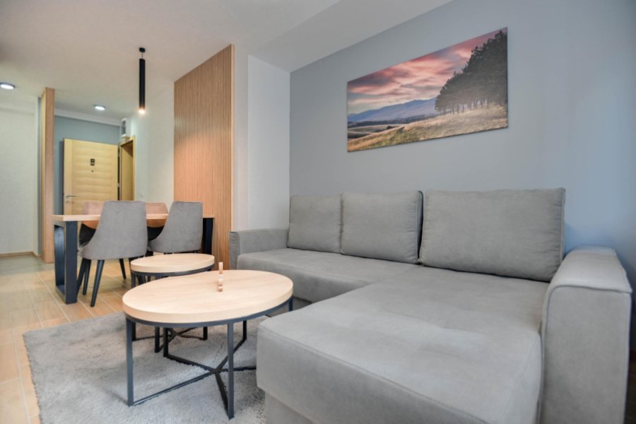 Apartman se sastoji od predsoblja, dnevnog boravka, dve spavaće sobe, kupatila, kuhinje i terase. Kuhinja je potpuno opremljena i uključuje ugradni šporet sa rernom, frižider, kao i posuđe i pribor za ručavanje.